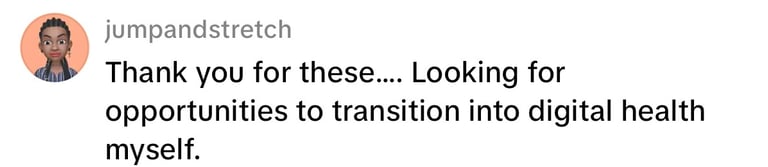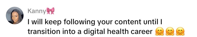 Here, you'll see the real-world impact of my digital health career education through TikTok engagement, community voices, and a growing collection of valuable resources designed to inspire and empower the next generation of digital health leaders.